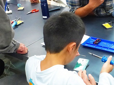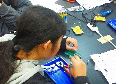 製作開始前に、プリント基板へのはんだ付けの練習を念入りに行なったため、参加者全員が